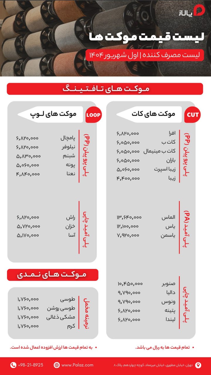 جهت مشاور و دریافت قیمت پالاز موکت با توجه به متراژ خود همین حالا میتوانید با شماره ها ما تماس بگیرید . توجه داشته باشید قیمت محصولات طبق لیست کارخانه بوده و شما میتوانید پالاز موکت را با قیمت کارخانه تهیه کنید .